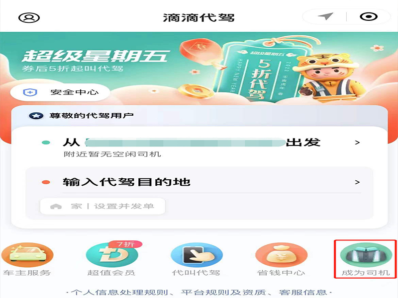2、在滴滴代驾小程序页面上,点击“成为司机”,进入司机加盟页面。