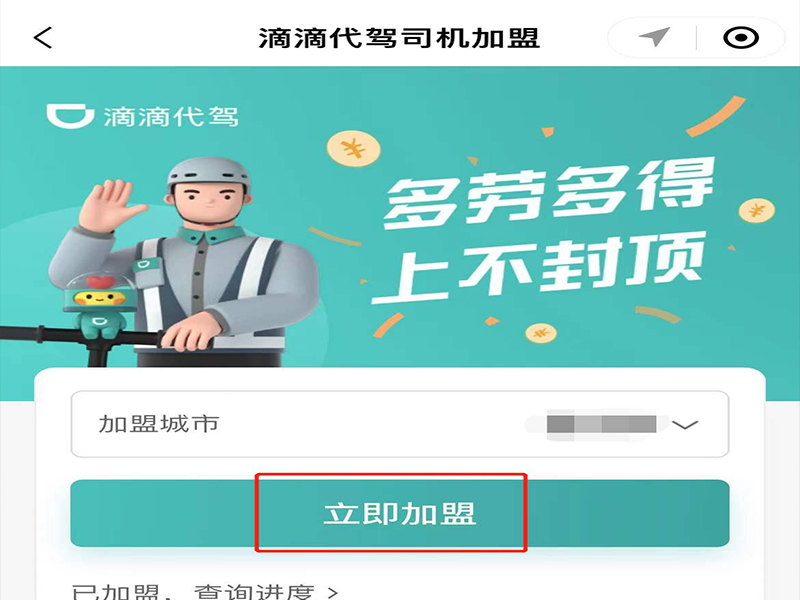 4、在滴滴代驾司机加盟页面上,选择加盟的城市,并点击“立即加盟”,即可申请加入代驾平台。