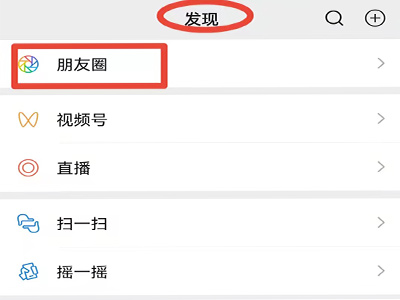 1、打开微信app,切换到“发现”页面,点击“朋友圈”。