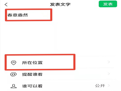 3、输入文案,如“春意盎然”,点击“所在位置”。