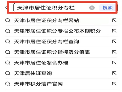 1、打开百度app,在搜索框内输入“天津市居住证积分专栏”,点击“搜索”。