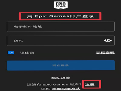 3、点击“登录EPIC GAMES”,点击下方的“注册”。