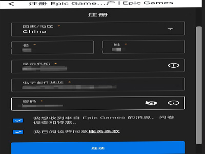 4、输入国家或地区、姓名、显示名称、电子邮件地址、密码等。