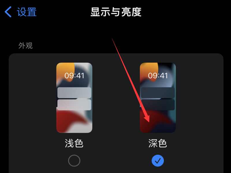 2、在外观一栏中勾选“深色”即可把iphone的深色模式打开。