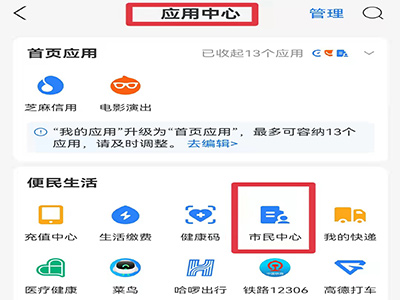 1、打开支付宝,点击“更多”进入应用中心,选择“市民中心”。