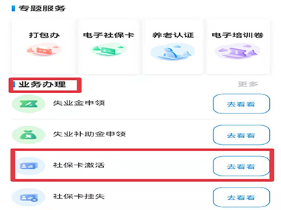 3、向上滑动手机屏幕,找到业务办理下的“社保卡激活”,点击其右侧是“去看看”按钮。