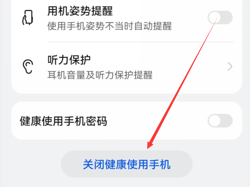 2、下滑页面,点击“关闭健康使用手机”按钮即可完成关闭。