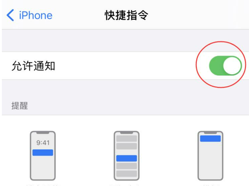 3、进入“快捷指令”设置页面中,把“允许通知”按钮关闭即可。