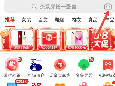 1、打开拼多多app,点击搜索栏旁边的照相机图标,进入主页。