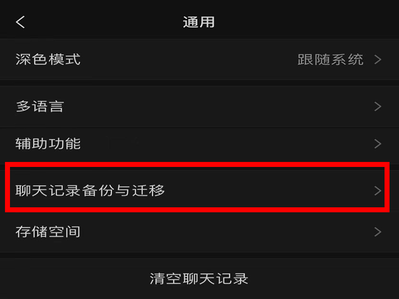 3、进入“通用”界面后,点击“聊天记录备份与迁移”,进入“聊天记录备份与迁移”界面。