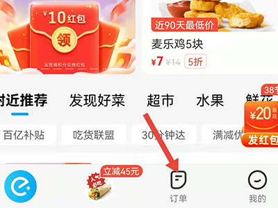 1、打开饿了么app,点击底部导航栏中的“订单”,进入页面。