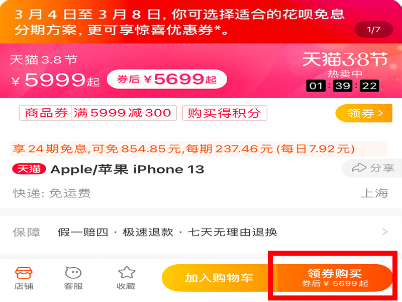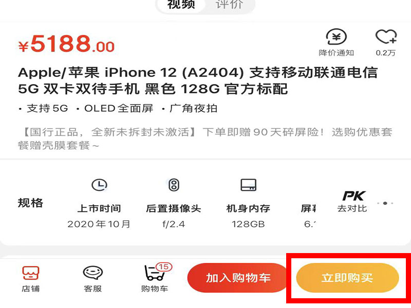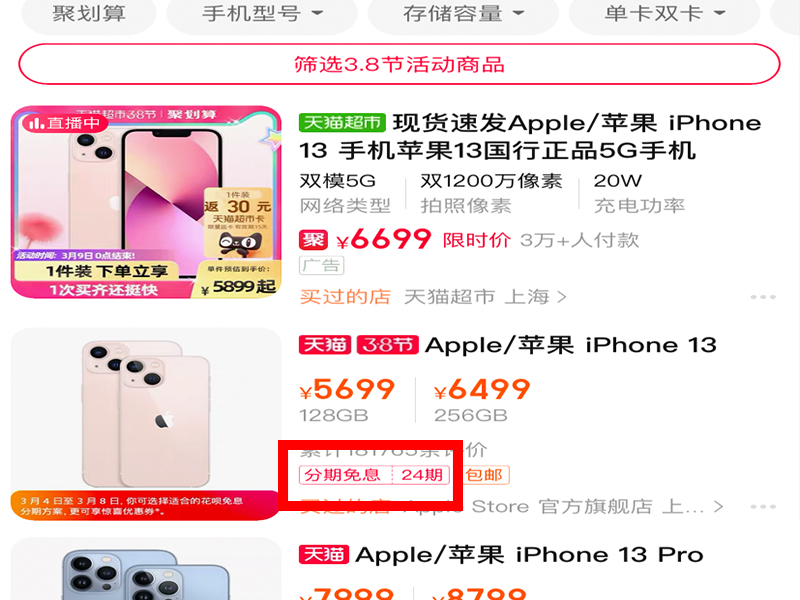 1、打开淘宝,搜索想要购买的手机,找到并点击有“分期免息”标识的商品,进入商品详情界面。
