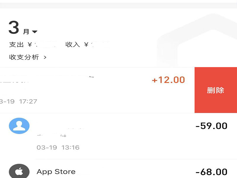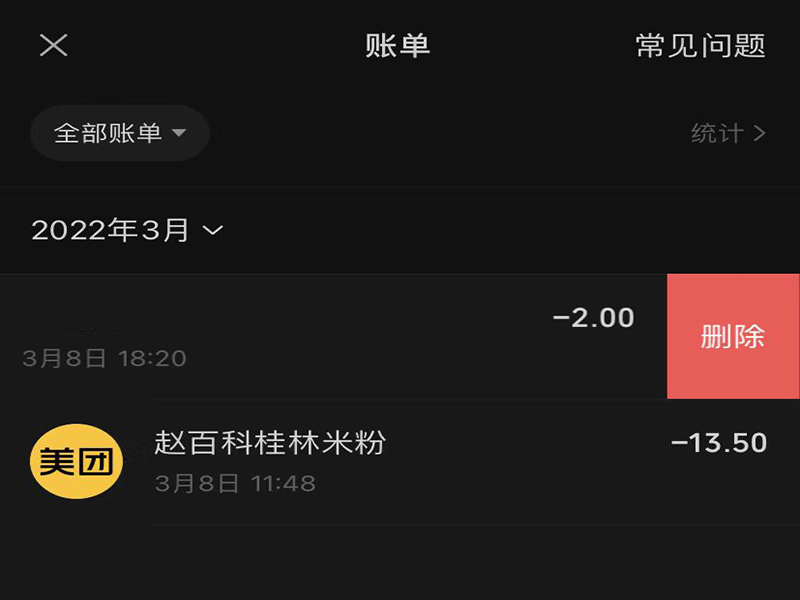 2、进入“账单”界面后,选择想要删除的账单明细,向左拖动,再点击“删除”即可。