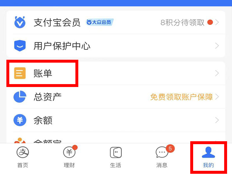 1、打开支付宝,点击进入“我的”的界面,再点击“账单”,进入“账单”界面。