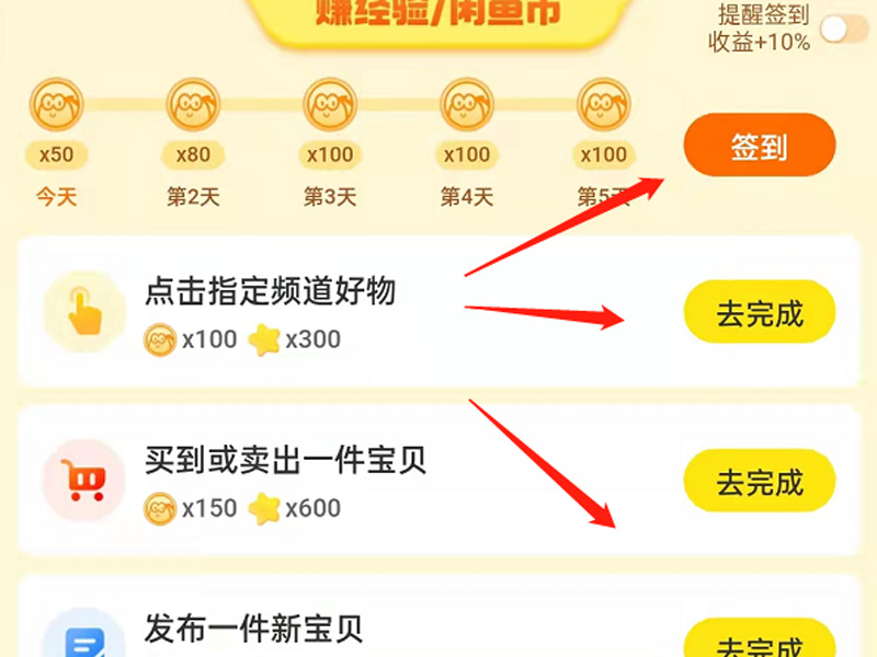 3、点击“赚经验”,即可看到闲鱼币的获取方式,完成指定任务即可获取闲鱼币。