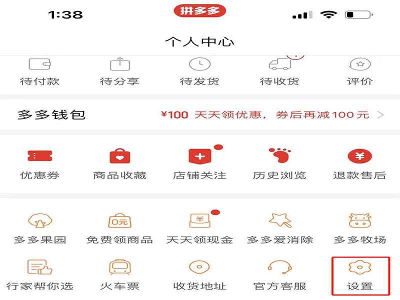 1、打开拼多多app,点击“设置”,进入拼多多设置页面。