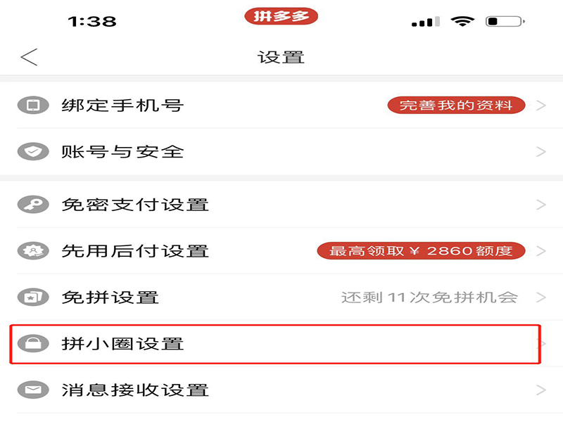 2、在拼多多设置页面上,点击“拼小圈设置”,进入拼小圈设置页面。