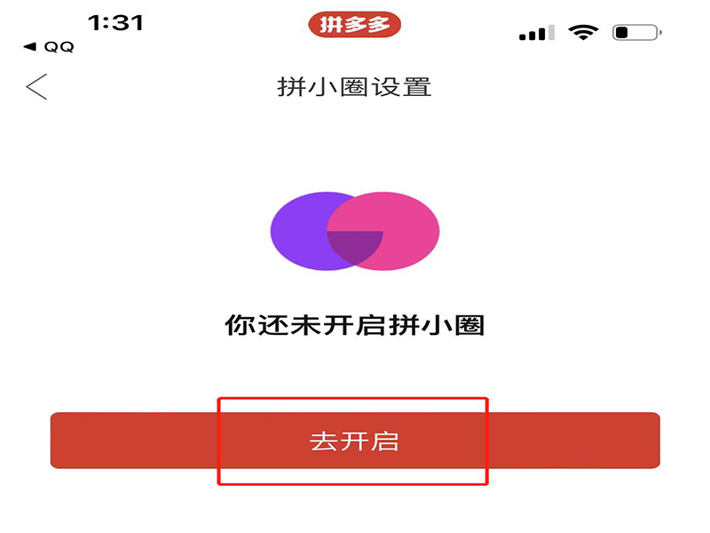 3、在拼小圈设置页面上,点击“去开启”,即可开启拼小圈功能,并进入拼小圈页面。