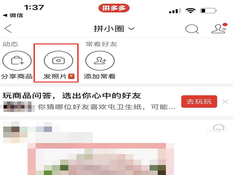 5、在拼小圈页面上,点击左上方的“发照片”,即可分享照片。