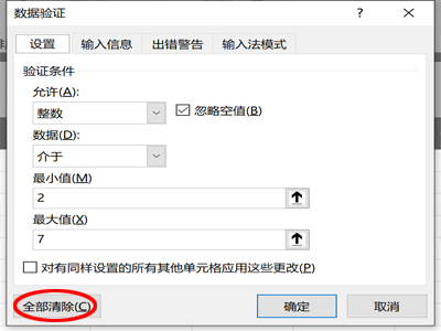 4、单击“全部清除”,即可以将数据验证全部删除。