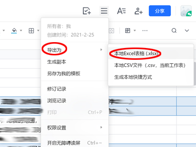 2、选择“导出为”,再选择“本地excel表格”,打开另存为窗口。