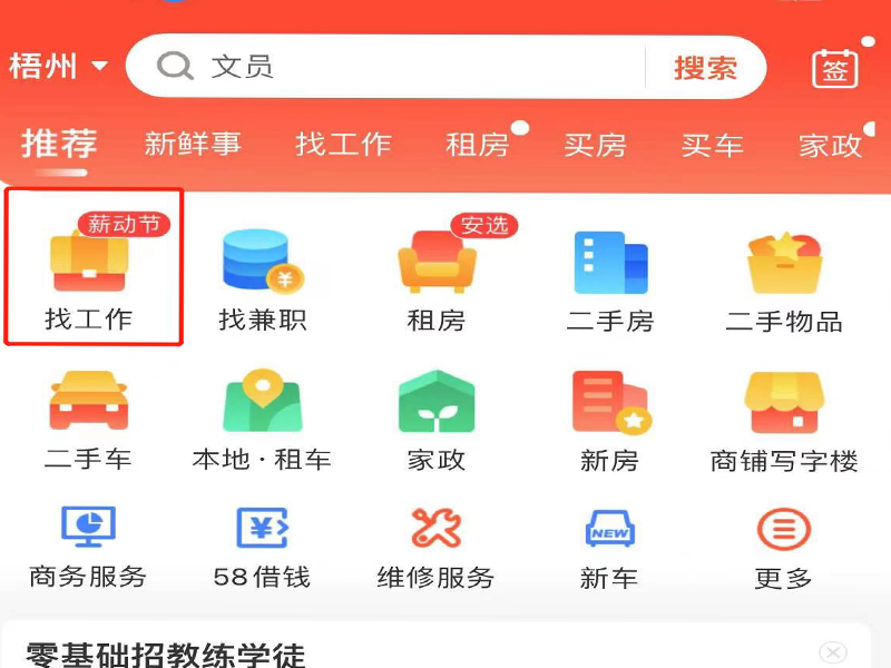 在手机上找工作可以通过一些求职软件寻找,比如有智联、Boss直聘、前程无忧、58同城等。以使用58同城找工作为列,具体操作如下: