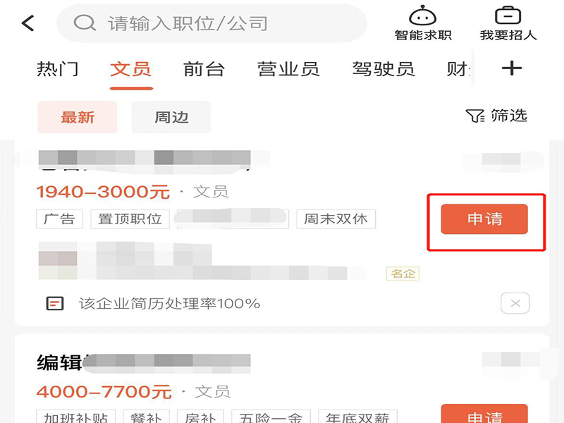 2、在找工作页面上,根据自身情况选择合适的工作岗位,点击“申请”,进入填写个人信息页面。