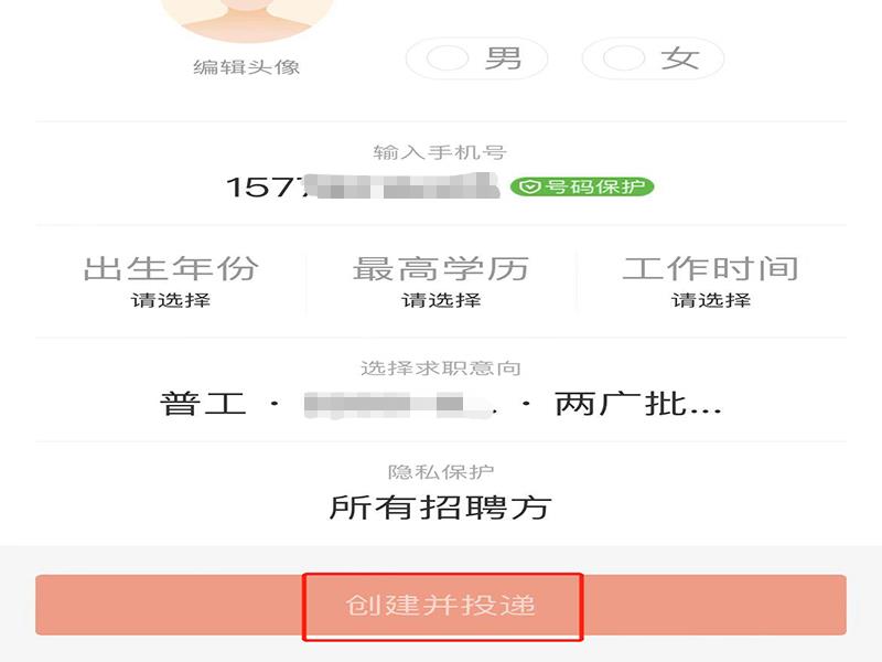 3、在填写个人信息页面上,输入个人情况,即可点击“创建并投递”,等待对方回复通过后即可进入面试环节。