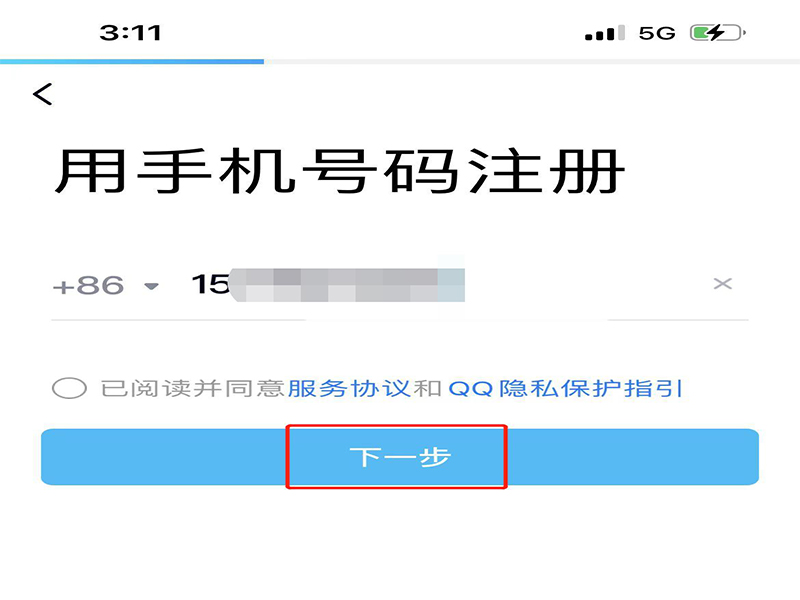 2、在手机号码注册页面上,输入手机号码,即可点击“下一步”,进入输入短信验证码页面。