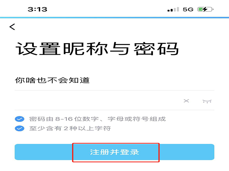 3、在输入短信验证码页面上,输入收到的短信验证码,即可进入设置昵称与密码页面。