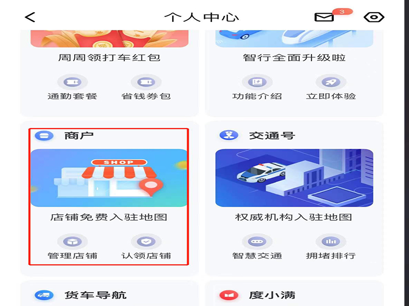 2、在个人中心界面上,找到并点击“店铺免费入驻地图”,进入商户入驻页面。