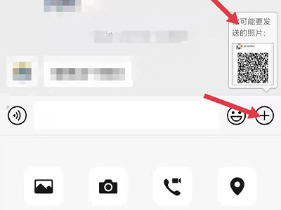 5、进入另一个群的聊天界面,点击“+号”,并点击图片发送,成员扫描后即可完成进群。