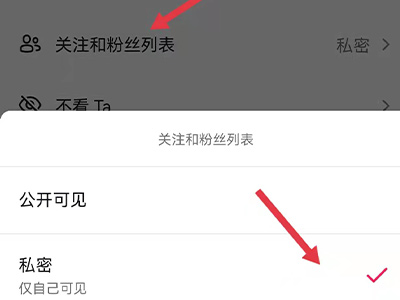 4、点击“关注和粉丝列表”,并选择“私密”即可完成隐藏粉丝数量。