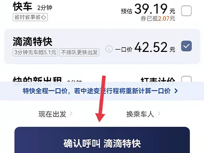 2、在页面中输入出行地和目的地,选择车型后点击“确认呼叫”即可完成叫滴滴。