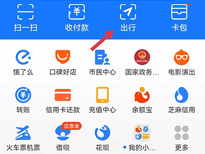 3、打开支付宝app,在主页的信息栏中,点击“出行”,进入页面。