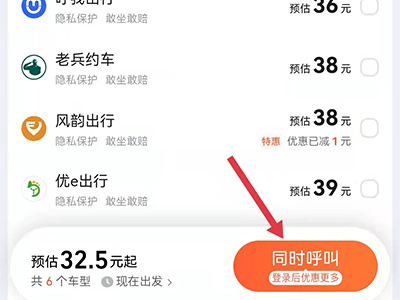 5、输入出行地和目的地,选择车型后点击“同时呼叫”即可完成叫滴滴。