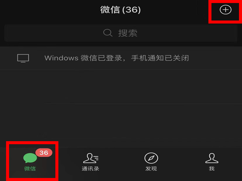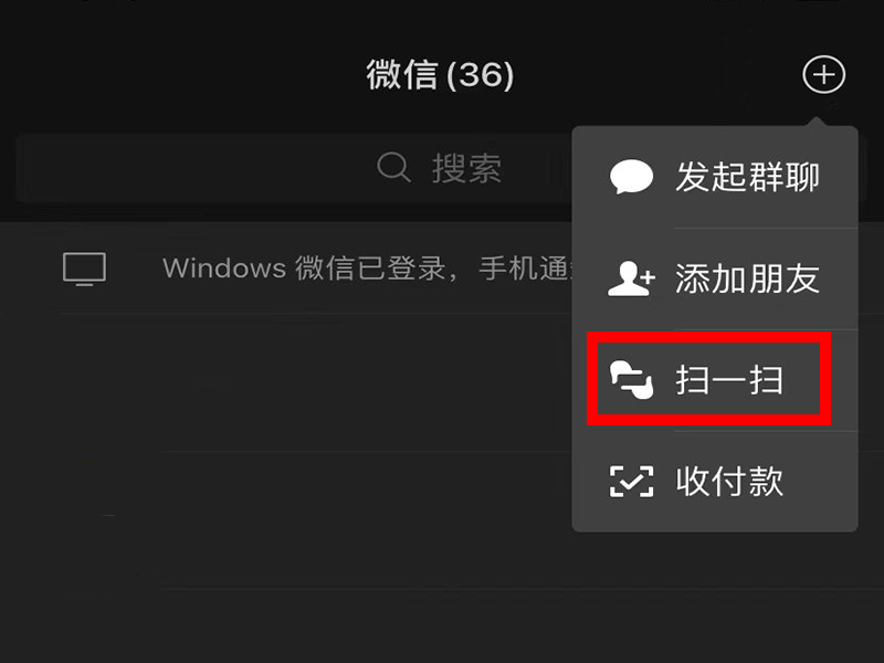 1、打开微信,进入主界面,点击右上角的“+”号,进入“扫码”界面。