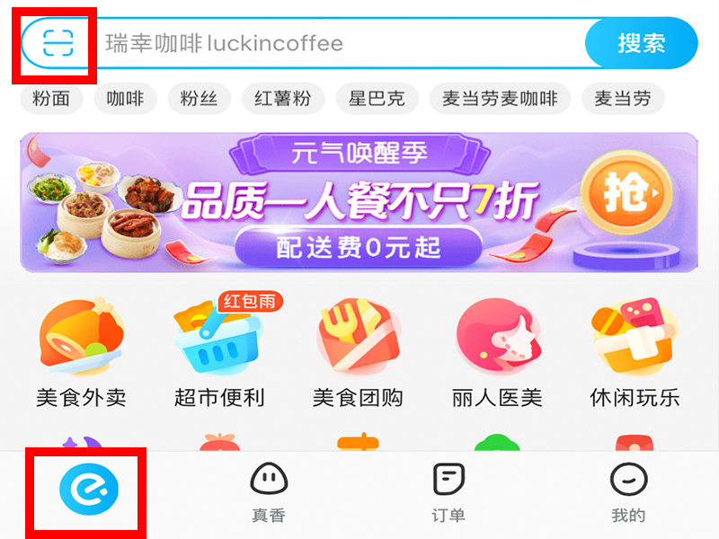 1、打开饿了么,点击进入“首页”界面,点击上方搜索栏的“扫描”符号。