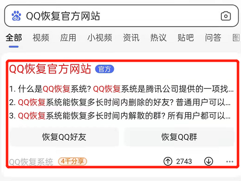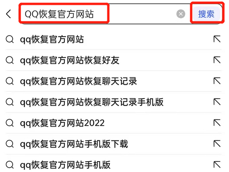 2、输入“QQ恢复官方网站”,点击“搜索”,得出搜索结果。