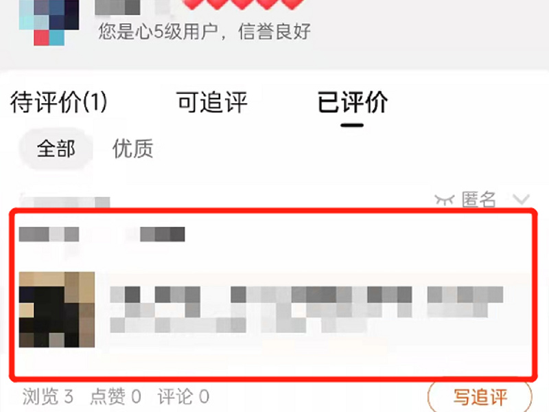 3、找到并点击自己五星好评的评论,即可进入五星好评页面。
