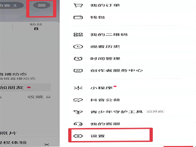 2、点击右上角的“三横”图标,点击下方的“设置”按钮。