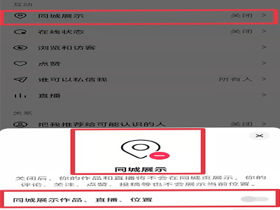 4、点击“同城展示”,关闭“同城展示作品、直播、位置”的按钮即可。