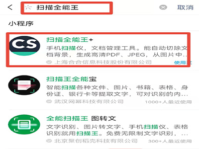 2、点击右上方的搜索图标,输入“扫描全能王”,点击“搜索”。