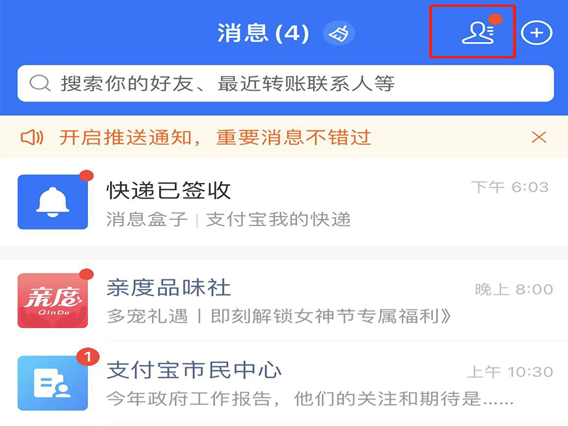 1、打开支付宝app,在消息页面上,点击右上方的人像图标,进入支付宝通讯录页面。