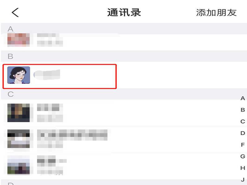 2、在支付宝通讯录页面上,选择拒绝转账的联系人,点击进入联系人的个人界面。