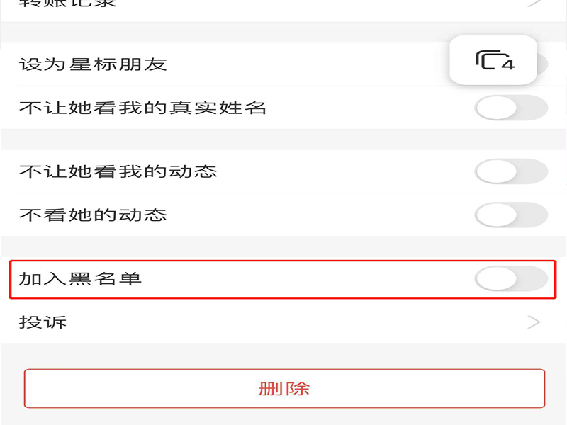 4、在联系人资料设置页面上,点击“加入黑名单”,即可拒收对方的转账。