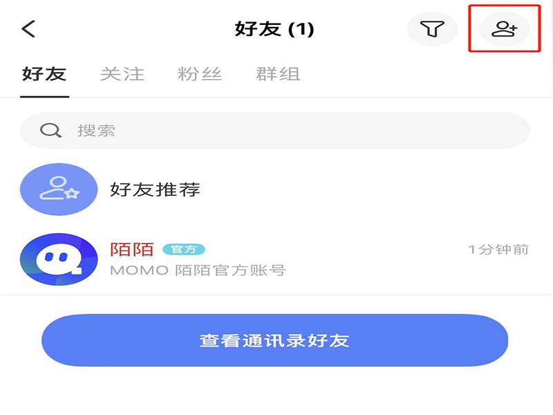 2、在好友页面上,点击右上角的人像图标,进入添加好友页面。