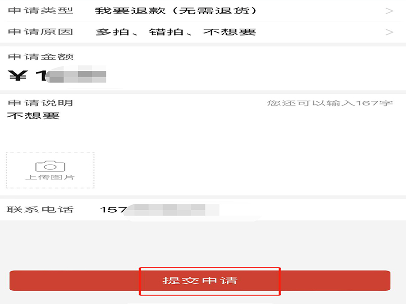 4、在申请退款页面上,填写好申请原因、申请说明,确认退款金额无误后,即可点击“提交申请”退款。