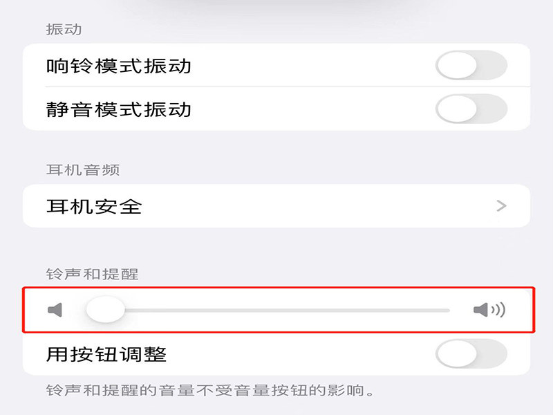 3、在声音与触感页面上,选择铃声和提醒,将音量浮标拉至最大,即可将铃声调大。