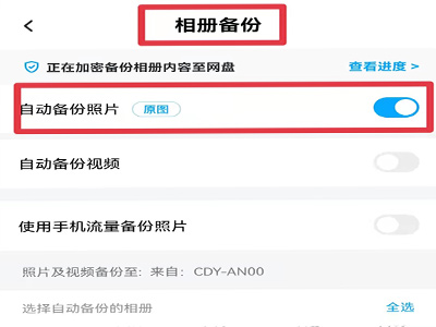 2、点击“相册备份”,开启“自动备份照片”右侧的按钮。